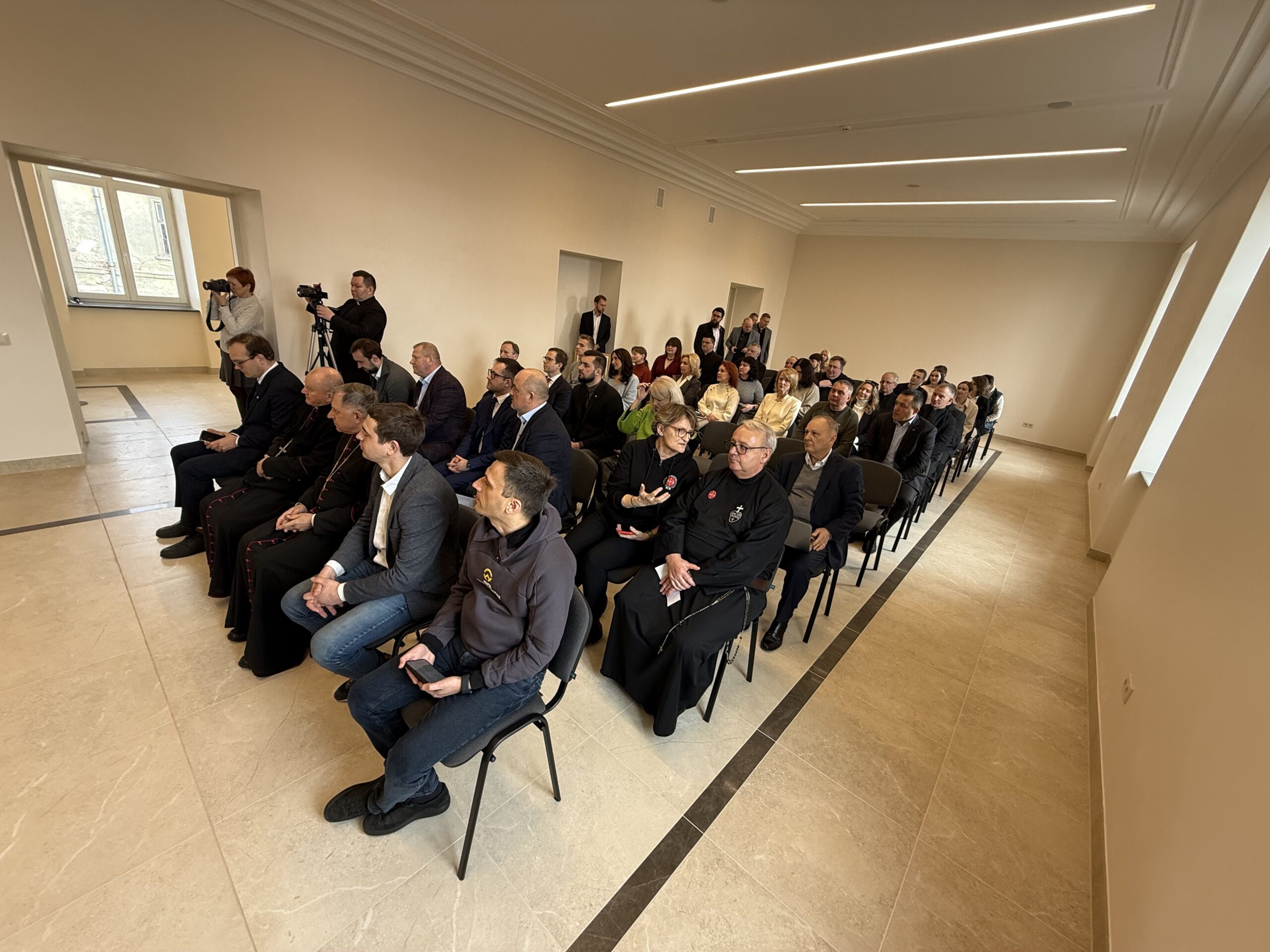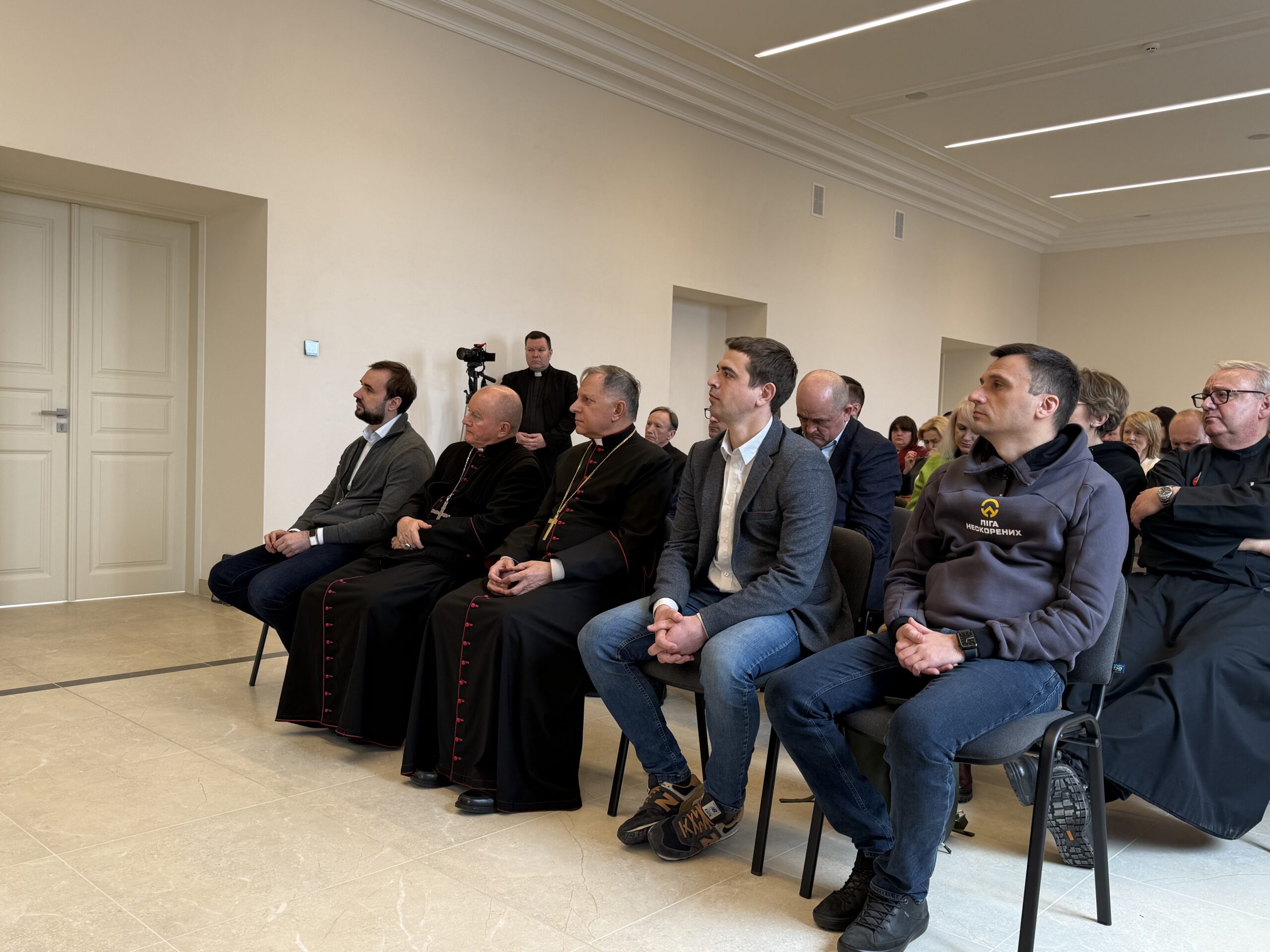 Присутні переглянули фільм про роботу з переселенцями, яку провадить Римсько-католицька Церква в Україні, після чого доктор медичних наук Борис Кузьмінов, який очолює Науково-дослідний інститут епідеміології та гігієни ЛНМУ, коротко розповів про отця-доктора Генрика Мосінга, на честь якого названо Центр підтримки.
