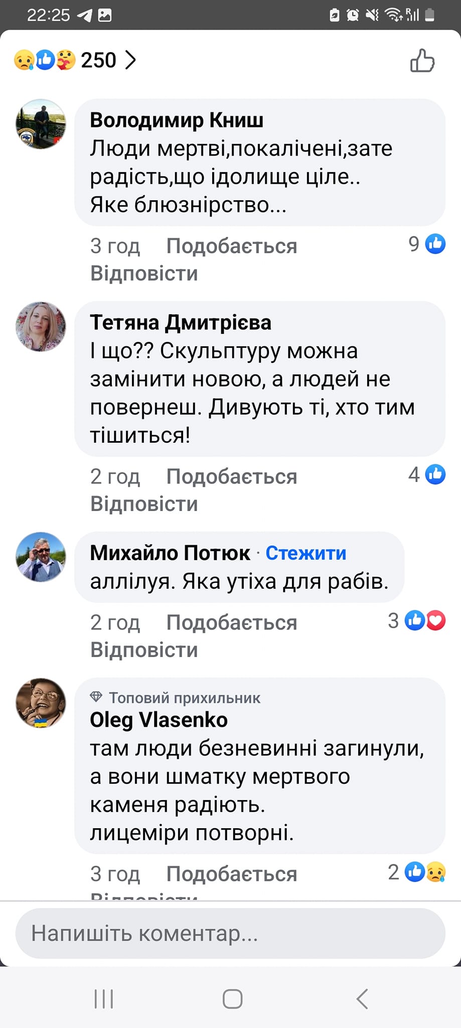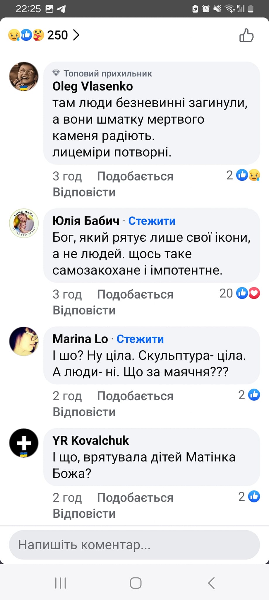 «Люди що з вами. камінь дорожчий за людей хай би лучше люди лишились живі», «не за кусок каменю треба радіти», «Абсолютно погоджуюсь з деякими коментаторами, що краще б люди залишились живі… Не знаю, чи з цього дому хтось загинув… Якщо так, то краще б цього “чуда” не було» – висловилися в коментарях. Дехто звинуватив опонентів у фанатизмі: «Віра з вас зробила не християнина, а фанатика, а це вже не здорово».