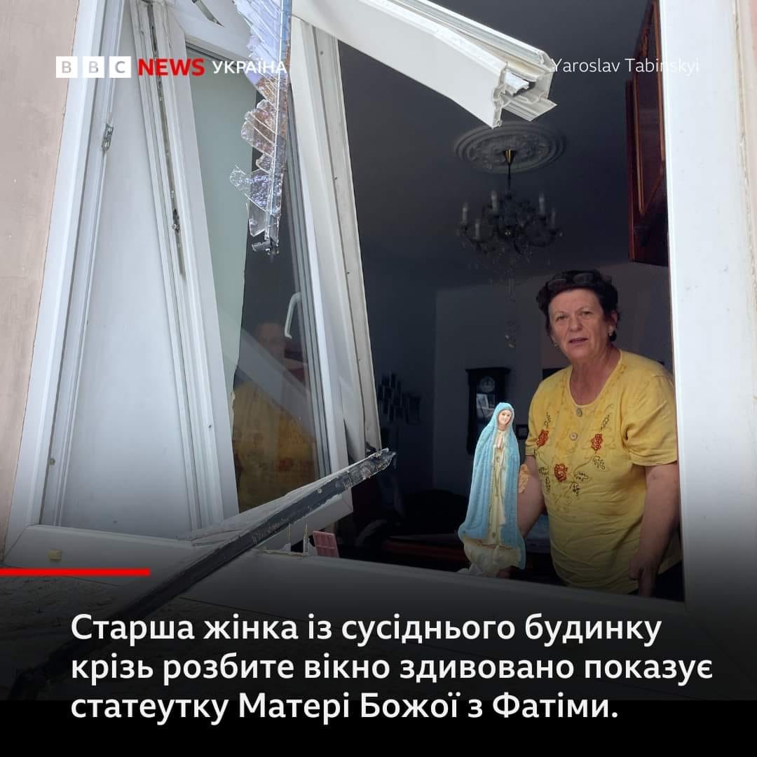 Вже у перші години після обстрілу соцмережами почало поширюватися фото зі сторінки Євгена Міклушки (автор фото – Андрій Бонцаревський), на якому зафіксовано неушкоджену фігуру Богородиці біля розбитого ворожим ударом вікна. Цю світлину поширило понад дві сотні користувачів та ЗМІ.