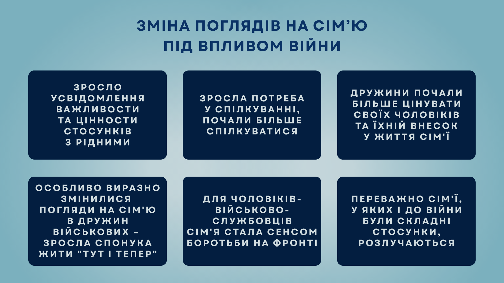 Виразно змінилися погляди на сім’ю в дружин військових – зросла спонука жити «тут і тепер»; дружини почали більше цінувати своїх чоловіків та їхній внесок у життя сім’ї, а для чоловіків-військовослужбовців сім’я стала сенсом боротьби на фронті.