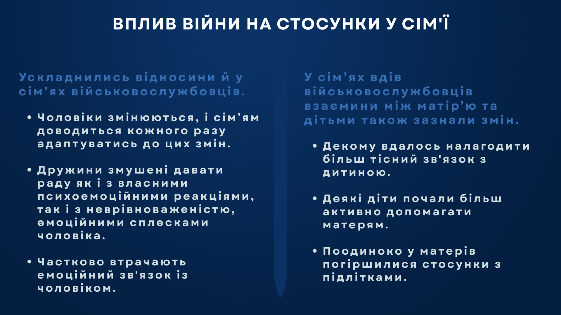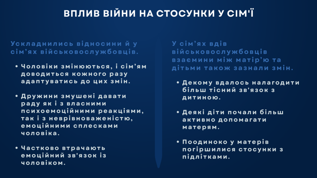 Ще один показник – у сім’ях військовослужбовців ускладнилися відносини. Зокрема чоловіки змінюються, і сім’ї змушені щоразу адаптуватися до цих змін. Дружина в таких ситуаціях мусить давати раду як із власними психоемоційними реакціями, так і з емоційними, часто неврівноваженими сплесками чоловіка. Через це в подружжі частково втрачається емоційний зв’язок.