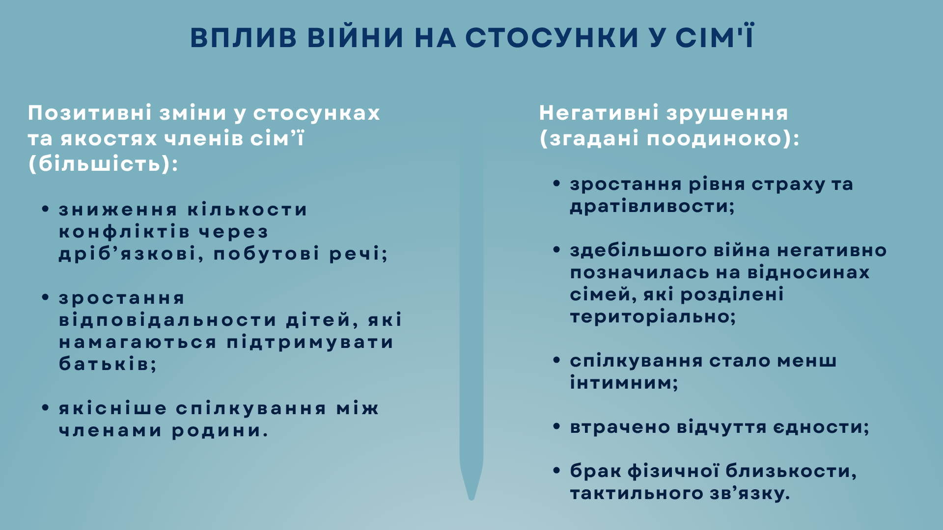 Опитування виявило зміни поглядів на сім’ю під впливом війни. Зокрема, за даними дослідження, зросло усвідомлення важливості та цінності стосунків з рідними, а також потреба у спілкуванні.