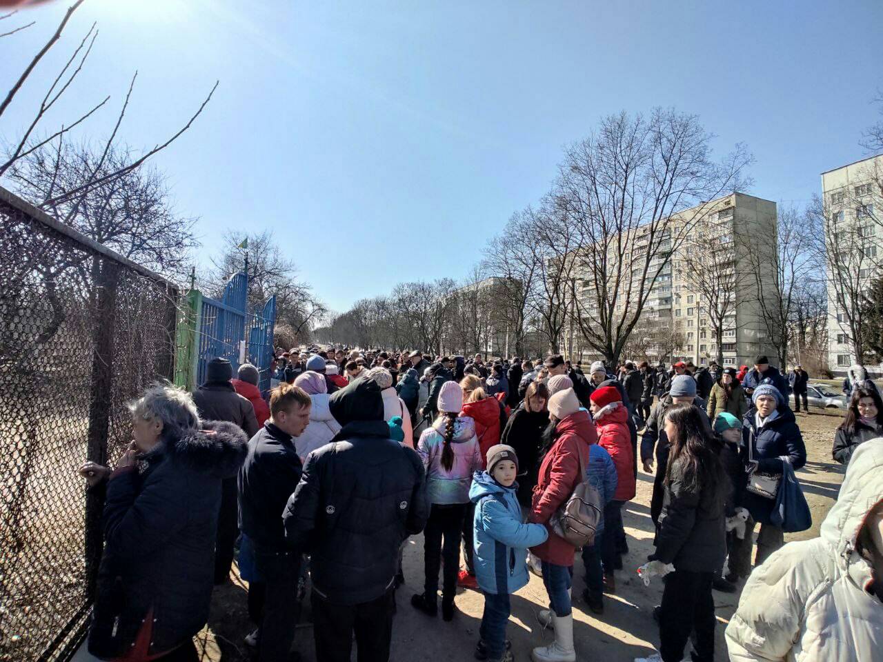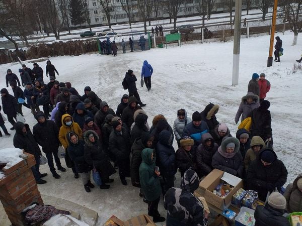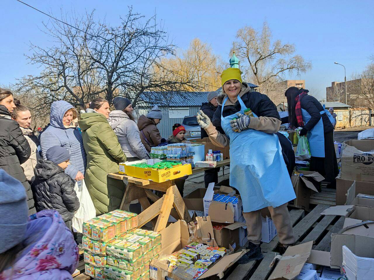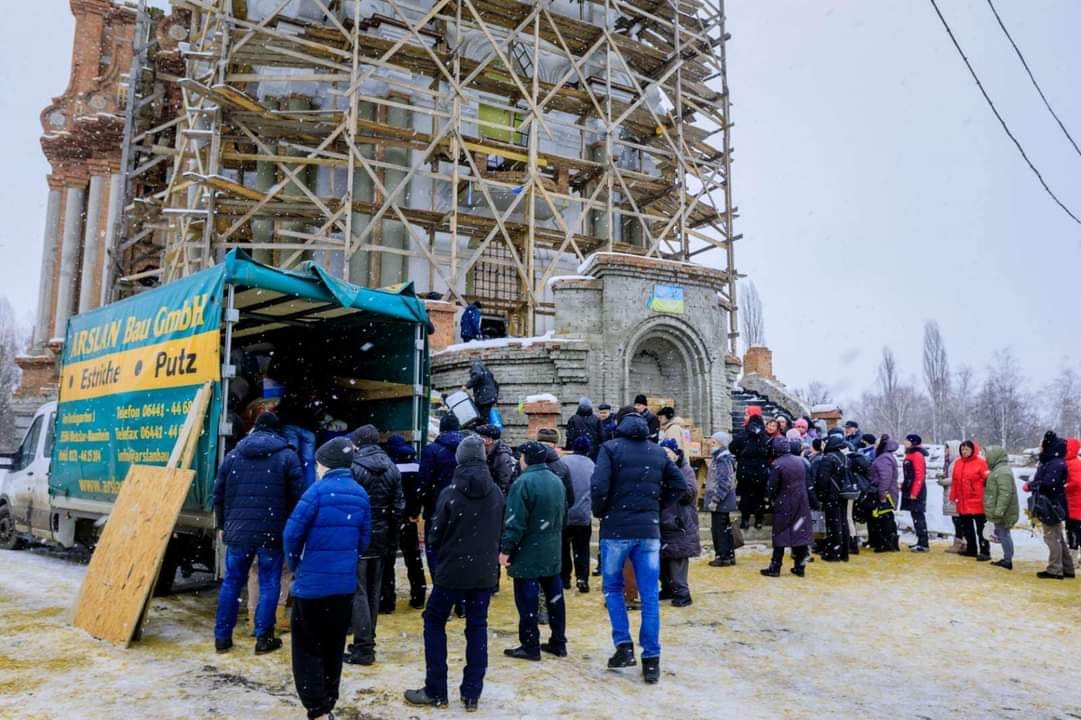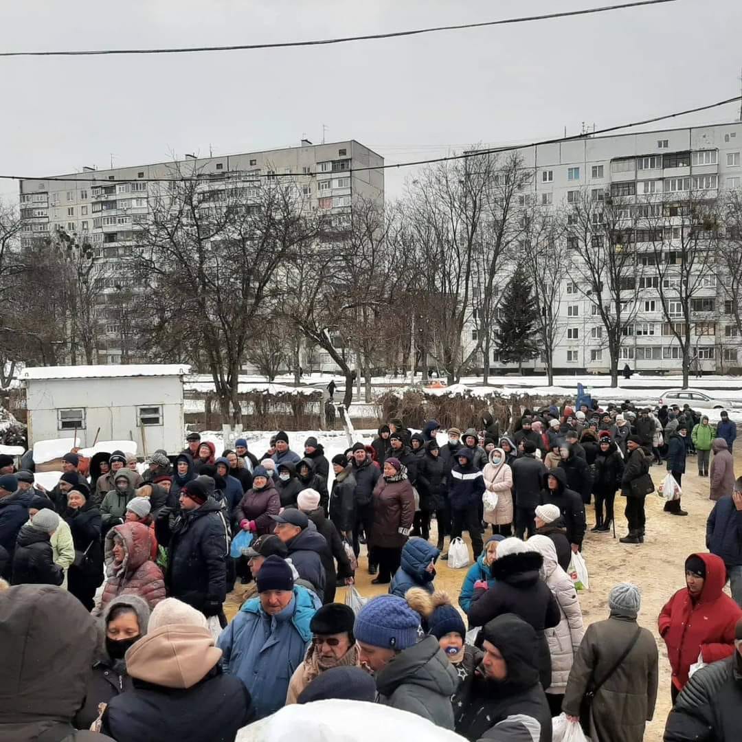 Видача гуманітарної допомоги харків’янам біля Катедрального Собору Святого Миколая УГКЦ в Харкові у перші тижні після широкомасштабного вторгнення росіян, березень 2022 року, фото: фейсбук-сторінка парафії собору