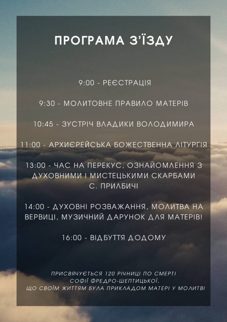 У програмі з’їзду – літургія з єпископом-помічником Львівської Архиєпархії УГКЦ Володимиром (Груцою), духовні розважання, молитва на вервиці, музичний дарунок для матерів та ознайомлення з духовними і мистецькими скарбами с. Прилбичі – родинного села Шептицьких. Ця зустріч стане можливістю дізнатися більше про Софію Фредро-Шептицької, що своїм життям була прикладом матері у молитві.