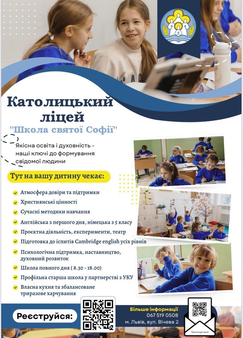 Католицький ліцей «Школа святої Софії» оголошує набір учнів на 2026–2027 навчальний рік. Школа запрошує родини, які цінують не лише якісну освіту, а й виховання на основі християнських цінностей.